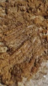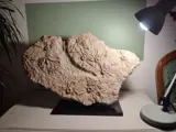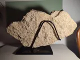 Plaat met fossiele zee-egels uit Neufchateau met een crinoïde. Dit bord wordt verkocht op een sokkel.