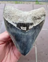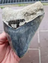 Ik bied een grote Megalodon-tand aan in een zeldzame blauwe kleur en in perfecte staat. Perfecte punt, emaille, in elkaar grijpende en geweldige zwarte bourlette. De tand komt uit Indonesië en is niet gerepareerd of gerestaureerd. Een hoogtepunt in elke collectie!!
