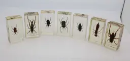 Set van zeven scarabee en andere insecten verpakt in Lucite-blokken.
