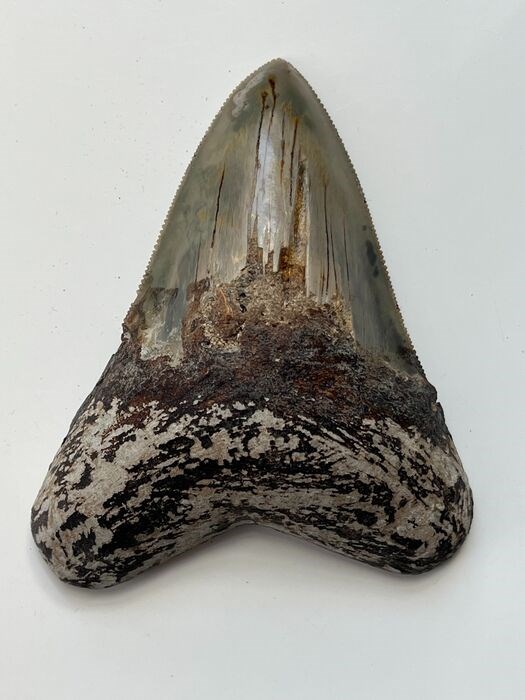 Kwaliteit Megalodon-tand, met goede punt, kartels en glazuur
