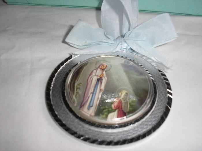 Lourdes, hanger voor boven in de wieg te hangen - z.g.a.n. Ook roze strik aanwezig- doe een bod, vanaf 10,-. Ga ik akkoord met je bod dan krijg je bericht