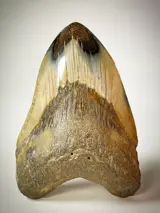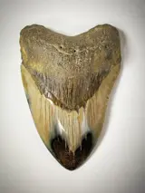 Deze Megalodon tand beschikt over een doorgaans beige kleur, met bruine accenten. De kleuren worden gevormd door de mineralen waarin de tand zich bevindt. Deze tand is gevonden in een rivier in Florida.