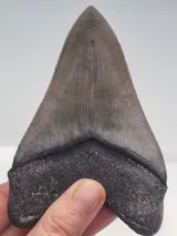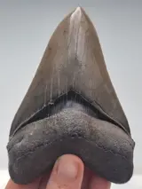 De fantastische tand van 11,8 cm van Carcharocles Megalodon komt uit Georgia en werd gevonden door een duiker voor de kust van Savannah op een diepte van 40 meter. Ondanks de vele miljoenen jaren in zee is de karteling vlijmscherp en zeer fijn. De zwarte bourelette is prachtig glanzend en uitstekend bewaard gebleven, wat zeer zeldzaam is. Afhankelijk van de lichtinval is het glazuur grijs of gelig. Een tand van de prehistorische reus die inspireert en waarvan de foto's voor zich spreken.