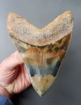 De Megalodon haai (Otodus Megalodon) is de laatste jaren, mede door documentaires en films, in populariteit toegenomen. En dat is ook niet gek: het is namelijk een gigantische haai die tot wel 20 meter lang kon worden en 60.000 kilo kon wegen! De Megalodon is dan ook één van de grootste roofdieren (vissen) dat ooit heeft geleefd. De tanden van de Megalodon zijn nagenoeg de enige fossielen die gevonden zijn van deze prachtige soort, en die tanden spreken boekdelen. De tand zelf is bijna perfect, het stuk van de kroon net onder de bourletteen is deels gerestaureerd. Dit is ongeveer tien procent van de kroon. De bourlette en wortel zijn gerestaureerd. De kleuren van dit exemplaar zijn adembenemend en worden niet vaak gezien.