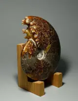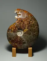 Een zeer mooie Aioloceras-ammoniet die aan beide zijden is gepolijst om de delicate hechtlijnen en honingcalciet die de camera vult te onthullen.