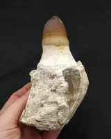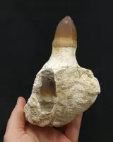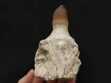 Zeldzame, goed bewaard gebleven mosasaurus Prognathodon currii (Christiansen & Bonde, 2002) kaakfragment met twee tanden. Een van de tanden zit nog in de kom.