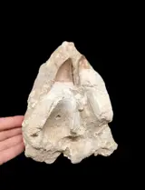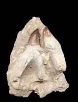 Een paar enorme tanden van de Mosasaurus die nog steeds in hun originele matrix zijn ingebed.