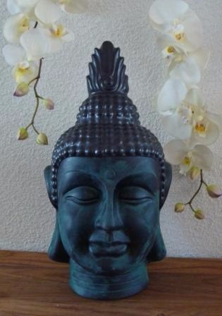 Dit mooie, decoratieve Boeddhahoofd is gemaakt van aardewerk en is circa 32 cm. hoog en 16 cm. breed.