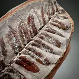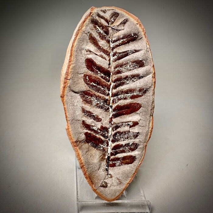 Een siderietconcretie die werd opengespleten om een impressie van een 3D-varen te onthullen.