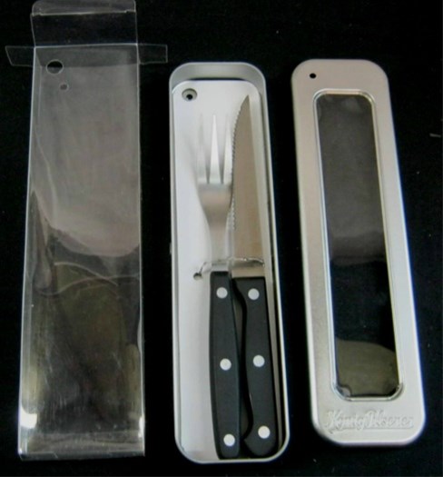 Steakbestek set met opdruk en reclamespreuk van het biermerk König Pilsener.