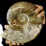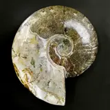 Een prachtige ammoniet uit Madagaskar van het geslacht Cleoniceras, gekenmerkt door een grijs/donkerbruin gebied met goed gedefinieerde en zeer mooie hechtlijnen, en de rest in een crèmekleur met het hele oppervlak rijk aan opalescentie variërend van roze tot groen.