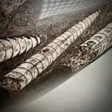 De rijke kleur van de specimencentra maakt snel plaats voor de kleur van de matrix. Bij deze schoonheid strekken de prachtige wit- en grijstinten van de orthocera's zich helemaal uit om het gepolijste gebied te vullen (zie foto's).