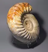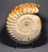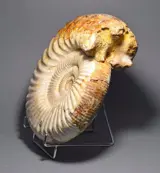 Een fijn gepolijste ammoniet Kranaosphinctes met mooie witte schelp. Zeer decoratief exemplaar met grote binnenkransen en natuurlijke parelmoer schelp behouden. Een paar kleine plekjes zijn gerestaureerd (zie foto's).
