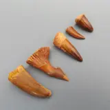 Tand 4: Dromaeosaurus was een dinosaurus van ongeveer twee meter lang. Hij liep op zijn achterpoten, had veren en was warmbloedig. Een van de bekendere soorten van de familie van Dromaeosauridae is de Velociraptor. Deze tand heeft een afmeting van 2,2 cm. Fijne karteling. Mooi patina