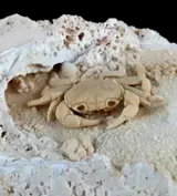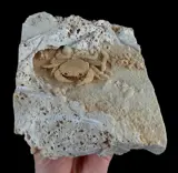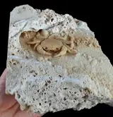 Spectaculair Potamon-fossiel perfect gearticuleerd en compleet. Dit exemplaar wordt gevonden in de grot die het bewoonde. Grote exemplaren zijn uiterst zeldzaam vanwege hun kwetsbaarheid. Deze zoetwaterkrab wordt gevonden in de travertijngroeven in het zuidwesten van Turkije. De exemplaren zaten vast in de holtes waarin ze leefden, daar werden ze bedekt met een dun laagje calciumcarbonaat. Het exemplaar presenteert alle benen, evenals de tang.