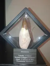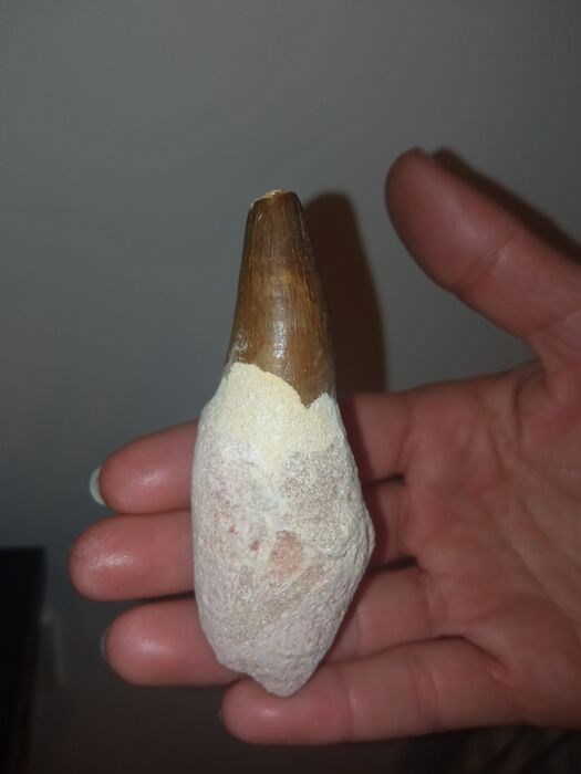 Ongelooflijke en zeldzame mosasaurus-tand, gewortelde tand waardoor het een zeer zeldzaam en 100% compleet stuk is, de tand is in een perfecte staat van bewaring en meet in totaal meer dan 8 cm, uit het Krijt van Afrika.