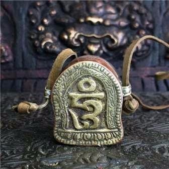 Dit Tibetaanse reisaltaartje met Aum teken is gemaakt van koper en is als ketting te dragen. Het hangt aan een brede veter (lengte circa 70 cm.) van yakleer. Het altaartje zelf is circa 4 cm hoog, 3,5 cm. breed en 1,8 cm. dik.