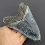 Dit is een schitterende grote prachtig gekleurde tand van de uitgestorven groottandhaai; Carcharocles megalodon. De tand heeft een prachtig bewaarde karteling en is vlijmscherp. Deze tand is 14,1 cm lang en 9,7 cm breed. Hij is gevonden in een zandsteenlaag bij Sukabumi in West Java, Indonesië.De tand komt uit het Mioceen en is tussen de 15 en 20 miljoen jaar oud. De tand is volledig origineel, geen restauratie. Prachtige grijs, blauw zwarte kleuren. De foto's spreken voor zich.