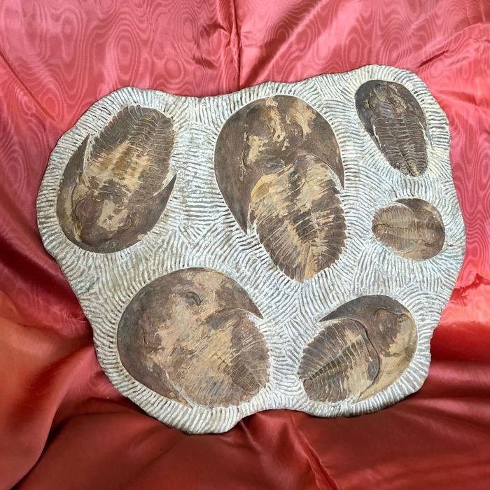 Groot bord met 6 limonitiseerde trilobieten. Het grootste exemplaar meet 20 cm en het kleinste 9 cm. De matrix meet 38x46 cm en weegt ongeveer 7 kg. Cambropallas telesto uit het Cambrium van Alnif, Marokko