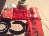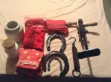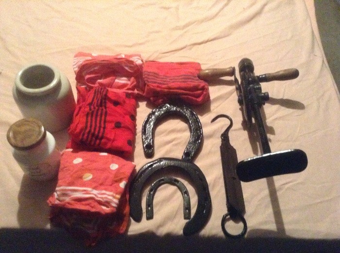 Uit de goede ouwe tijd voor verzamelaars, een beetje van alles ,drie paarden hoefijzers,vier rode boerensjaal ,een gewone gebakken aarden pot,een mostaardpot, een paternoster , een handboormachine van vroeger, een weegschaal voor zakken te wegen met de hand zoals vroeger en verschillende maten van trechters
