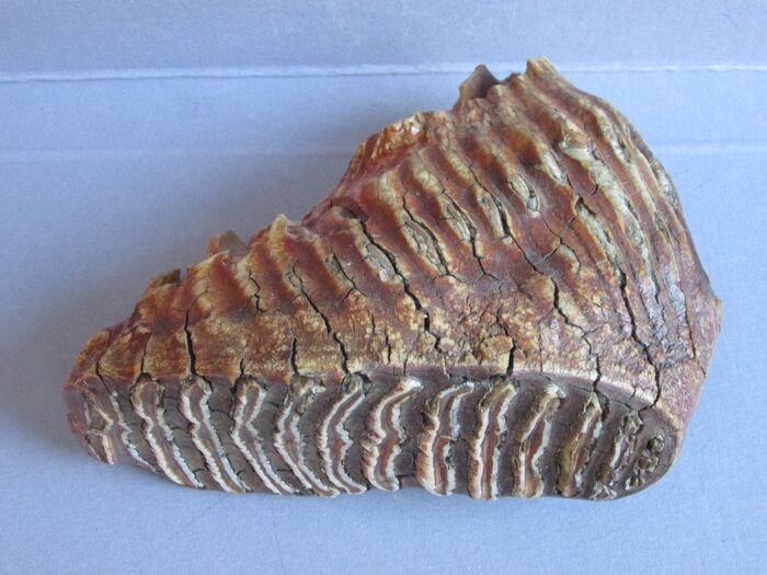 Toont de droogscheuren in het buitenoppervlak die typerend zijn voor Siberische mammoettanden. De oorspronkelijke dealer heeft de scheuren echter gestabiliseerd en behandeld met een conserveringsmiddel. Gekocht in 2017.