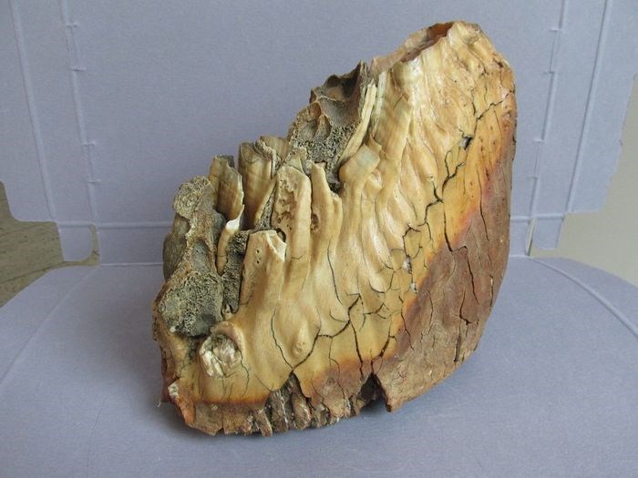 Dit is een bijzonder zware bovenste M3 kies van een Siberische mammoet. Aan de wortels zitten nog wat stukjes bot vast. Weegt ongeveer 5,5 KG.