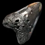 Deze fantastische megalodon-tand heeft een bijzonder contrasterende kleur, met een intens zwart in het centrale deel dat aan de uiteinden vervaagt naar blauwe tinten. Ook wordt de bovenkant van de tand gekenmerkt door bruine tinten.