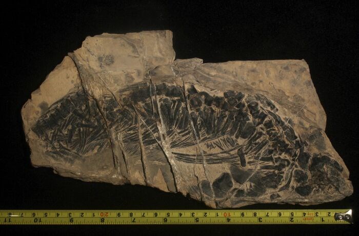 Gemengde Ichthyosaurus-fossielen die naast twee mineralen bestaan. De witte is kwartserts en de roestkleurige bloemvormige is ijzererts. De details van het fossiel zijn duidelijk en de vorm is driedimensionaal. Zelfs de sporen van ligamenten en neurale poriën op de botten zijn duidelijk zichtbaar. Jong, slechts kleine reparaties, verstevigde rug