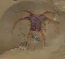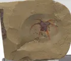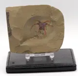 Dit is een zeldzame marellomorph met een diameter van ongeveer 4,0 cm. Het is goed gecentreerd op zijn natuurlijke matrix en is professioneel voorbereid. Houd er rekening mee dat die fossielen worden gevonden tijdens het splijten van de schalie, dus deze is gelijmd vóór de voorbereiding. Het fossiel zelf is compleet.