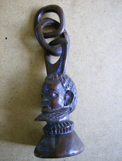uit 1 stuk hout gesneden afrikaans hoofd met 2 ringen