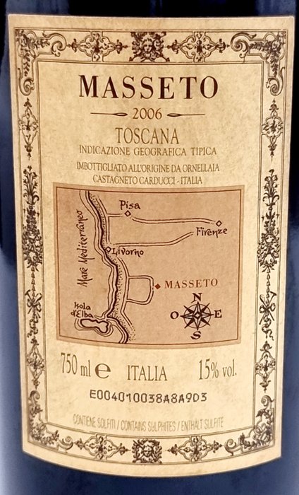Masseto 2006, 100/100 en il punteggio che Robert Parker ha riservato for questa grande bottiglia, semper più rara da reperire, rarissima se le condizioni sono come in questo caso splendide, come potete notare dalle foto fatte con lampada a led bianco, al suo interno il vino è brillante di un rosso rubino scuro, senza a minima ondoorzichtig of velatura.