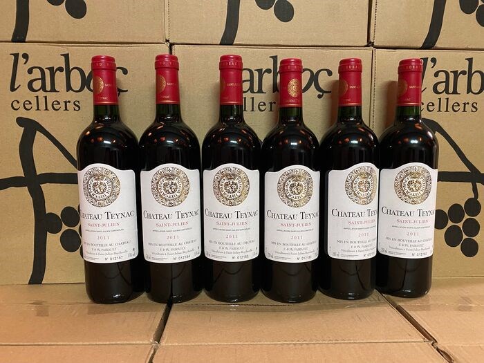 This lot contains 6 bottles of Chateau Teynac 2011 Saint-Julien Cru Bourgeois 75cl. The bottles have been preserved in a wine storage warehouse all these years. Chateau Teynac is a Cru Bourgeois, indicating the quality of this Chateau.