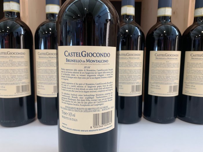 Brunello di Montalcino "Castelgiocondo" en een vino che si fa portatore dello scorrere del tempo e del rispetto della tradizione, valore che la cantina Marchesi de' Frescobaldi, ancora oggi, dopo 700 jaar geleden, continu een rimarcare in bekende sua etichetta. Als je een territoriaal rosso hebt, is het potentieel van Sangiovese all'interno di uno dei terroir più rinomati di tutta la Toscana, en het regala een sorso potente mai fuori controllo, semper armonioso grazie ai tannini eleganti. Una bottiglia che si conferma ai vertici dell'intera denominazione, kom getuigenis geven van de belangrijkste rivalen van de settore italiane en straniere.