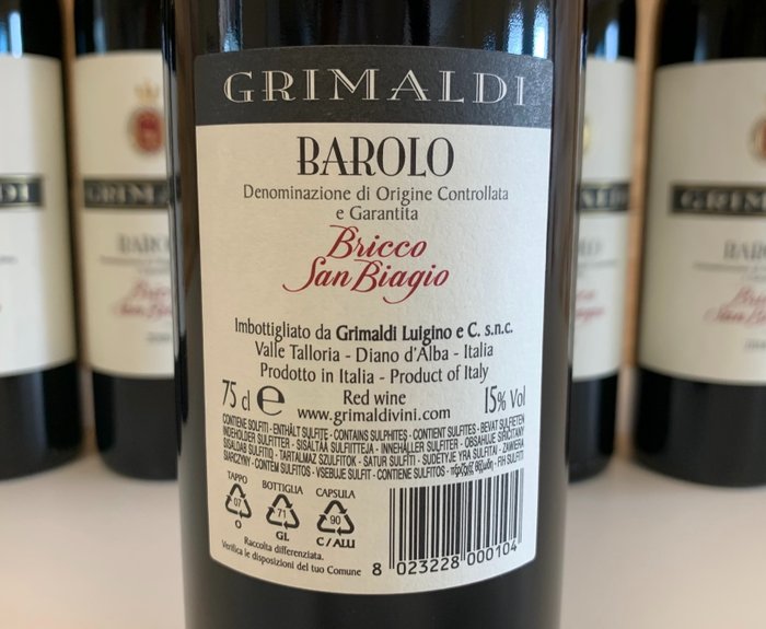Il Barolo DOCG Grimaldi "Bricco San Biagio" proviene dal vigneto all'interno del cru Bricco San Biagio in de gemeente La Morra. Het is een groot deel van de rovere per jaar en een deel in barrique da 225 litri di rovere francese. Il profumo è etereo en intenso di rosa appassita e violetta con note finali di frutta matura e spezie. Il sapore è secco fine, elegant en vellutato, di buona struttura con tannini morbidi and piacevoli, adatto a lungo invecchiamento. Si adatta a un buon invecchiamento. Perfetto per essere abbinato con selvaggina, arrosti, brasati, carne alla griglia en formaggi.