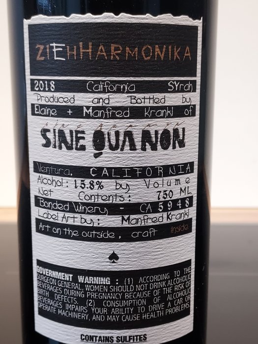 Aangeboden wordt één fles - in onberispelijke staat - 'Ziehharmonika' van de gerenommeerde wijnmakers van Sine Qua Non. Het oogstjaar is 2018.