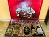 Alle flessen in zeer goede staat in een originele houten kerstkist, met daarin ook een glas en een verguld zilveren amfora Karaf en 5 glazen voor cognac.