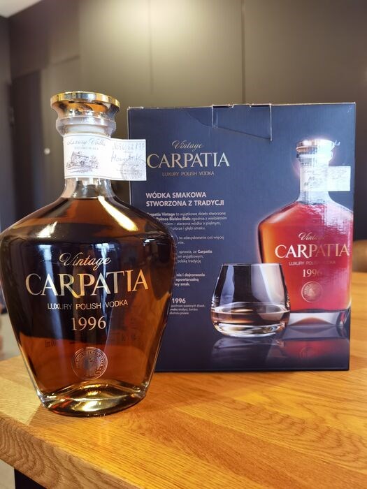 Dit is de eerste, oudste, gelimiteerde en individueel genummerde editie van Vintage Carpathia Luxury Polish Vodka 1996. De set bestaat uit een 0,7 fles en een zwarte kartonnen doos zonder het glas op de doos.