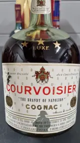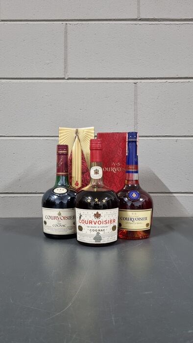 Drie zeer zeldzame flessen Cognac Trois Etoiles (Three Stars) van Courvoisier, beroemde producent uit de regio.