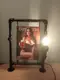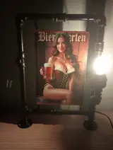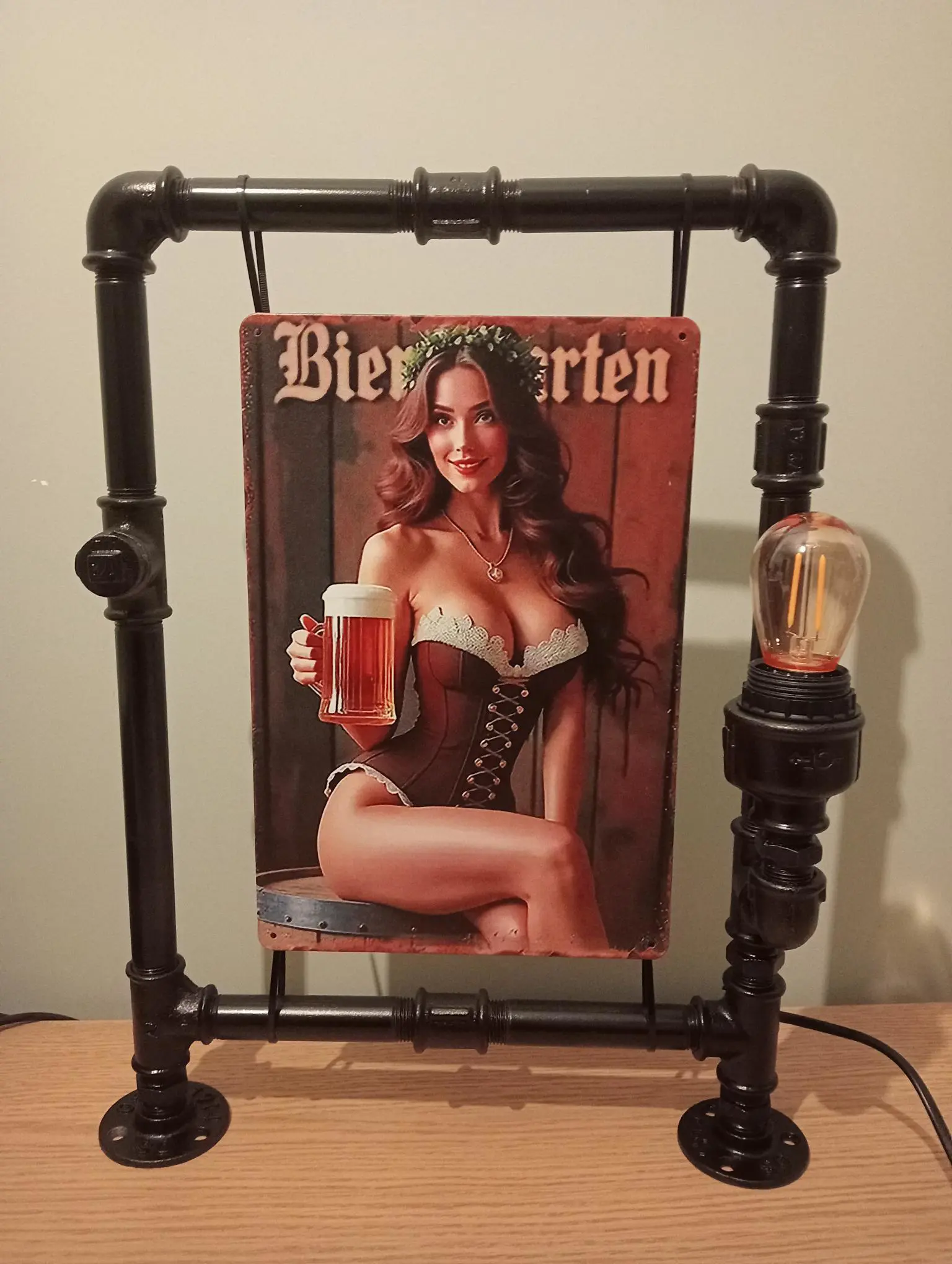 Industriële handgemaakte steampunk lamp met daarin een metalen retrobord van een biermeisje