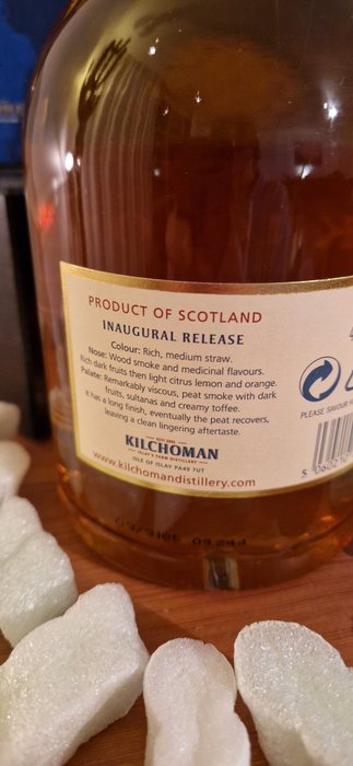 Kilchoman Inaugural Release Islay single malt Scotch whisky. De historische 1e algemene release-botteling van de nieuwste distilleerderij van Islay werd gelanceerd in september 2009. Gerijpt in ex-bourbonvaten gedurende maximaal 3 jaar en gefinisht in sherryvaten voor nog eens 6 maanden.