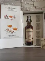 Een Classic Malts & Food Git Set, met een volle fles Knockando 12 Year Old single malt, gerijpt in bourbonvaten. Het wordt ook geleverd met vier kleine glaasjes en een receptenboek voor het combineren van de whisky met eten. Het receptenboek is echter in het Frans, let wel.