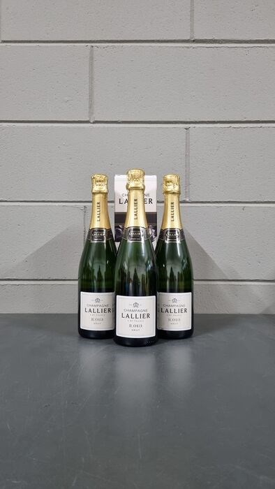 Drie zeer zeldzame flessen Champagne R.013 Brut van Lallier, beroemde maison in Ay.