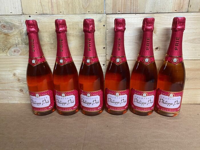 Dit kavel bevat 6 flessen Champagne Philippe Prié Brut Rosé 75cl. De gesloten doos stond in een koele en donkere ruimte. Philippe Prié is een kleine producent in Neuville-sur-Seine. Lokaal staan ze bekend om hun Rosé champagne.