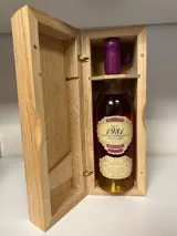 De cognac zit in een mooie handgeblazen fles in een houten kistje.