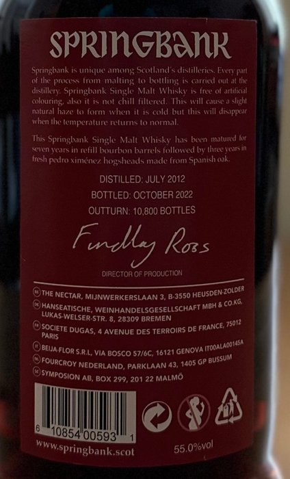 Single Malt 10 jaar oude op vat gerijpte Pedro Ximenez whisky gedistilleerd door Springbank in 07.2012
