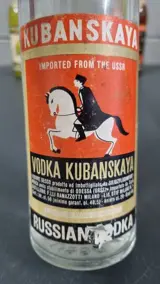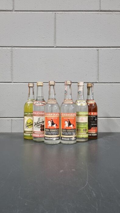 Twee flessen Kubanskaya (40%), een van Stolichnaya (40%), een van Moskovskaya (40% - jaren 70-80), een van Limonnaya (40%) en een van Starka Old (43%).