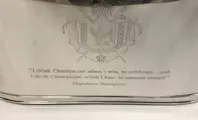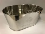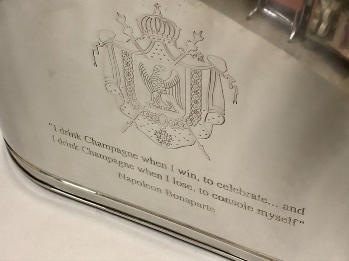 Grote vernikkelde kom in ovale vorm voor champagne- of wijnflessen met gegraveerde tekst van Lily Bollinger en Napoleon Bonaparte elk aan één zijde.