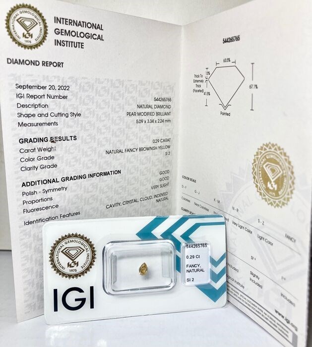 Een prachtige 0,29 karaat bruingele peer gemodificeerde briljante fancy colour diamant verzegeld in blister