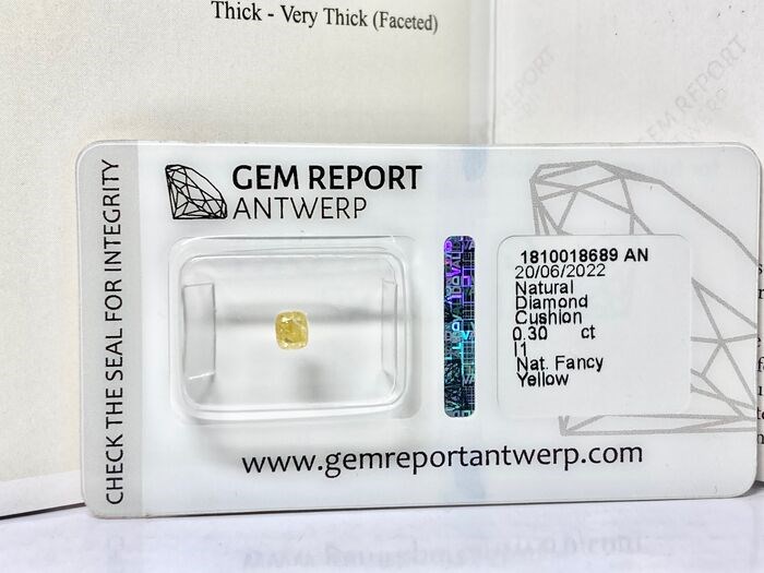 Een prachtige 0,30 karaat kussen geslepen fantasie gele kleur diamant verzegeld in blister
