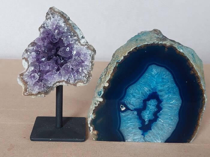 Blauwe agaatgeode en amethist druse op metalen standaard. Herkomst Brazilië.